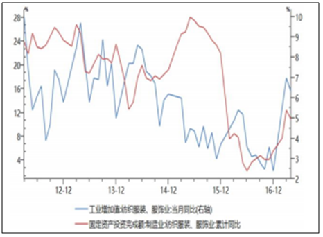 從需求來看,截止 2017 年 4 月,國(guó)內(nèi)紡織服裝、服飾業(yè)固定資產(chǎn)投資完成額累計(jì)同比增長(zhǎng) 10.90%,2017 年 3 月、4 月紡織服裝、服飾業(yè)工業(yè)增加值同比增長(zhǎng) 7.00%和 6.30%,行業(yè)需求復(fù)蘇跡象明顯。